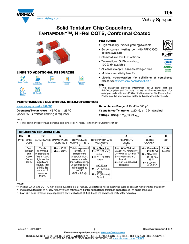T95 Solid Tantalum Chip Capacitors, TANTAMOUNT™, High-Rel COTS, Conformal...