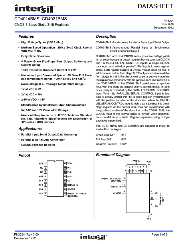 CD4021BMS CMOS 8-Stage Static Shift Register