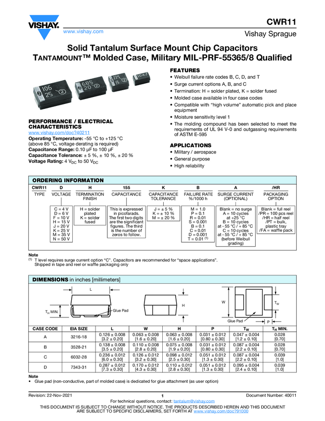 CWR11 Solid Tantalum Surface Mount Chip Capacitors TANTAMOUNT™ Molded Case,...