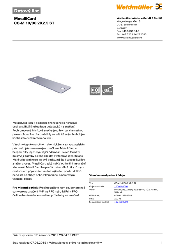Weidmüller 1500150000 CC-M 10/30 2X2.5 ST Tabliczka znamionowa srebrny Ilość znaczników: 200 200 szt.