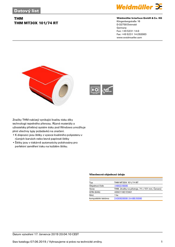 1466270000 Weidmüller 1466270000 THM MT30X 101/74 RT Tabliczka znamionowa czerwo...