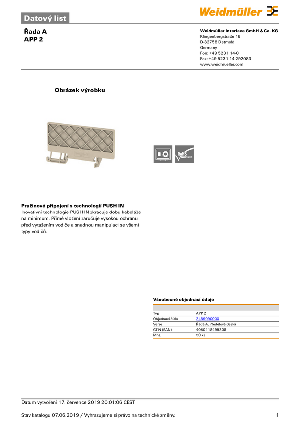 Ścianka rozłączająca Weidmüller APP 2 2489090000, 50 szt.