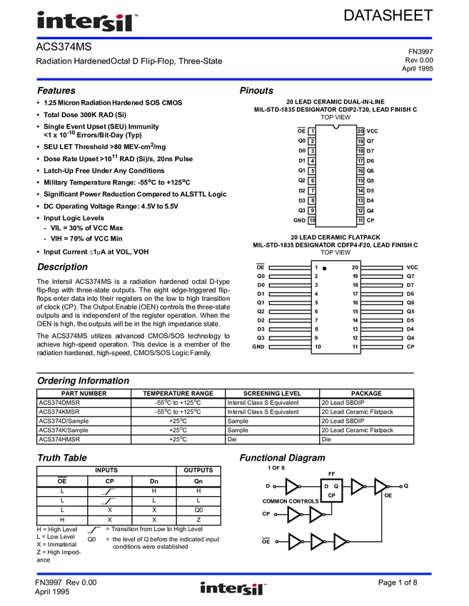 ACS374MS CMOS Octal D Flip-Flop, +Edge Triggered,Three-State