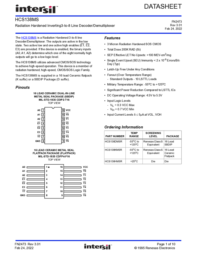 HCS138MS CMOS Inverting 3-to-8 Line Decoder/Demultiplexer