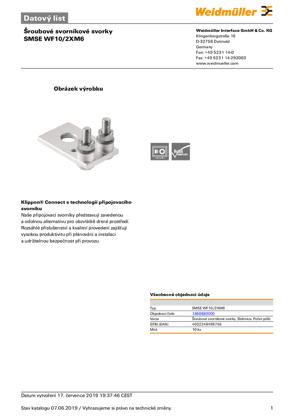 1868880000 Zacisk trzpieniowy Weidmüller SMSE WF10/2XM6 1868880000, 10 szt.