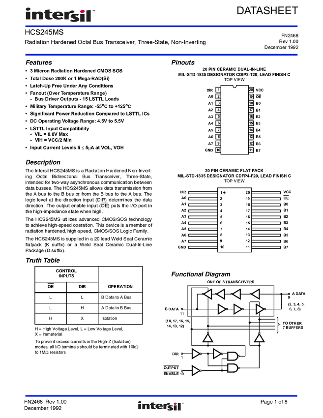 HCS245MS Octal Buffer/Line Driver, Three-State, Inverting