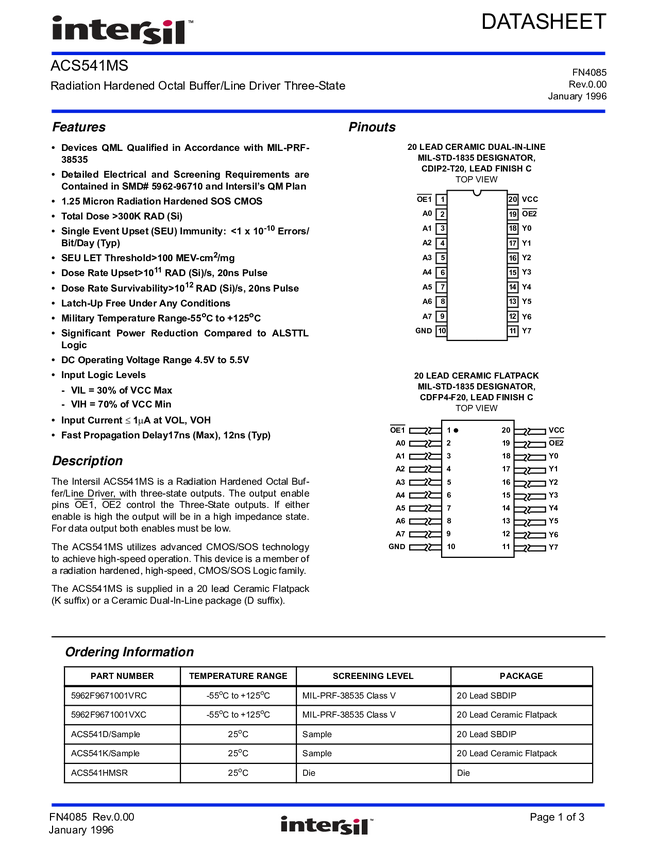 ACS541MS CMOS Non-Inverting Octal Buffer/Line Driver, Three-State