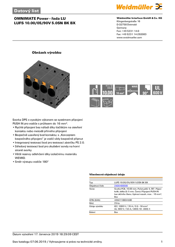 2500480000 Weidmüller 2500480000 Zaciski śrubowe 16 mm² Ilość styków 5 czarny 25 szt.