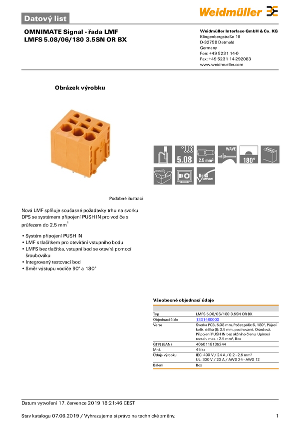1331480000 Weidmüller 1331480000 Zaciski śrubowe 2.5 mm² Ilość styków 6 pomarańczowy 4...