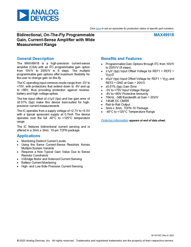 MAX49918 Bidirectional, On-The-Fly Programmable Gain, Current-Sense Amplifier with W...