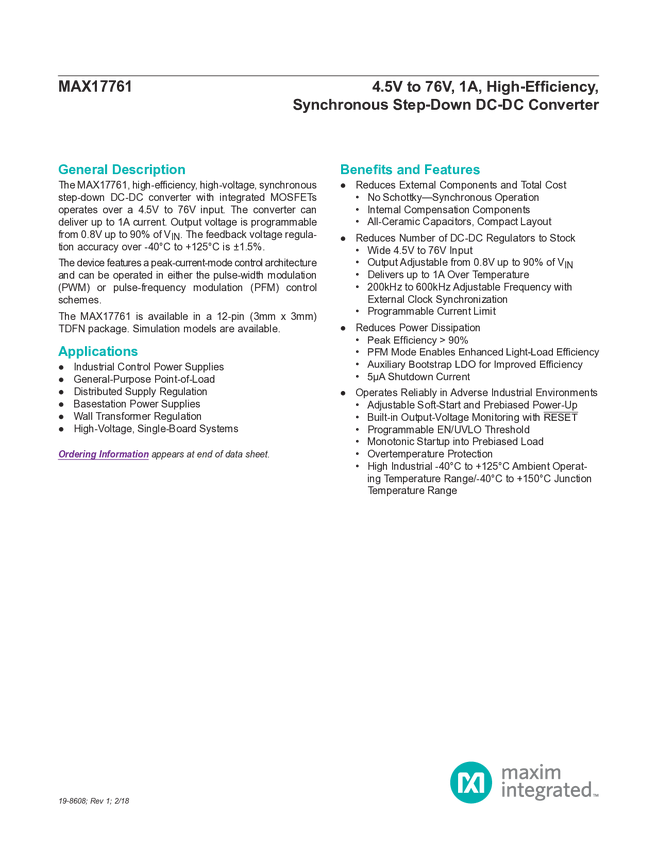 MAX17761 4.5V to 76V, 1A, High-Efficiency, Synchronous Step-Down DC-DC Converter