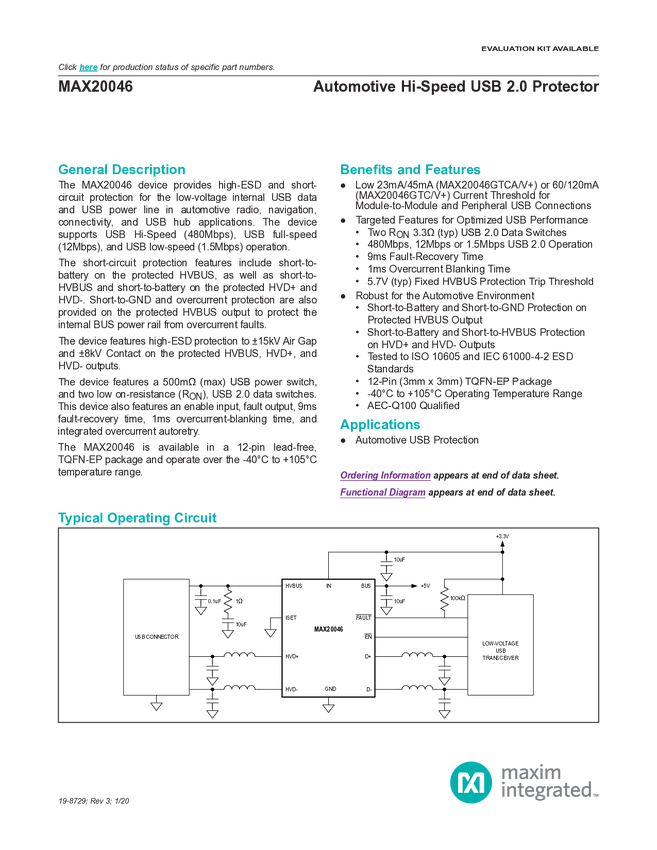 MAX20046 Automotive Hi-Speed USB 2.0 Protector