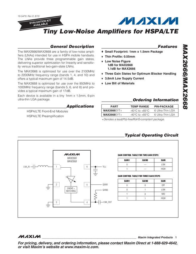 MAX2666 Tiny Low-Noise Amplifiers for HSPA/LTE