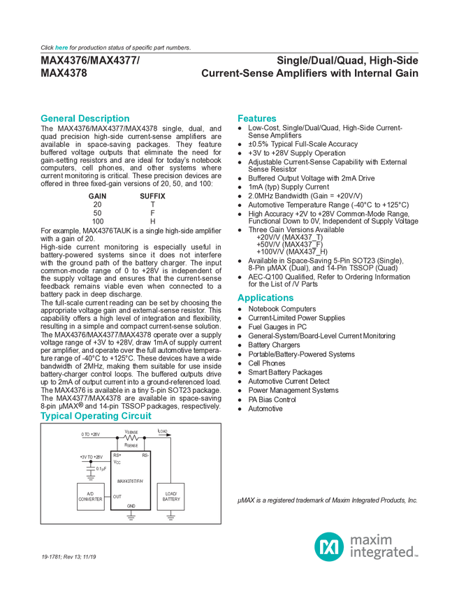 MAX4378 Single/Dual/Quad High-Side Current-Sense Amplifiers with Internal Gain