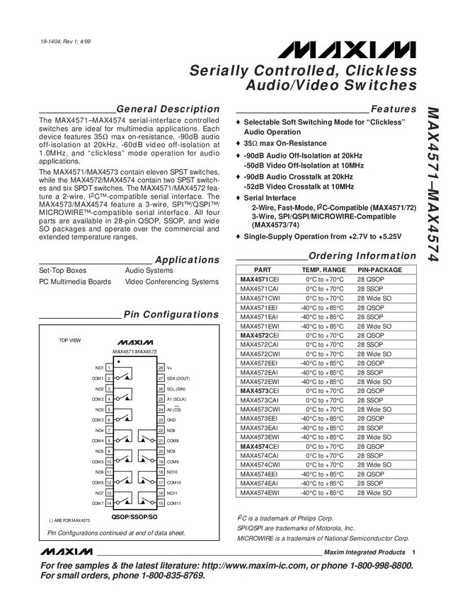 MAX4573 Serially Controlled, Clickless Audio/Video Switches