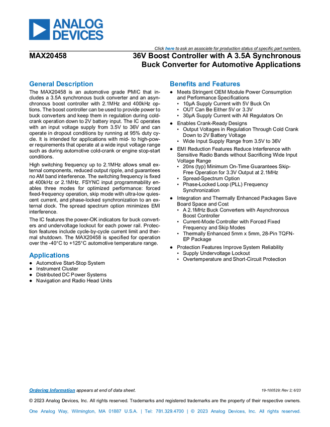 MAX20458 36V Boost Controller with 3.5A Synchronous Buck Converter For Automotive Ap...