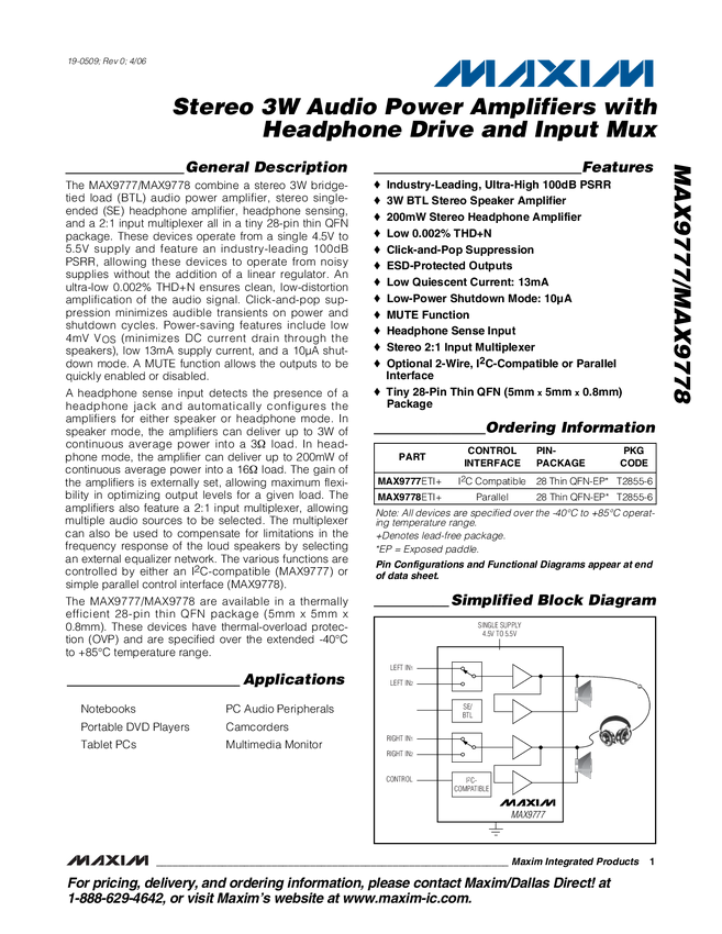 MAX9778 Stereo 3W Audio Power Amplifiers with Headphone Drive and Input Mux
