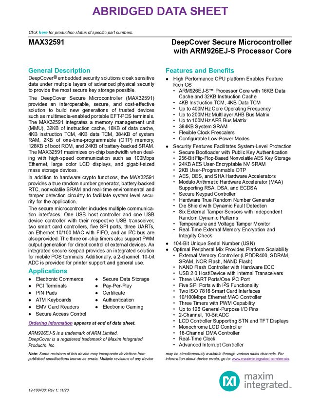 MAX32591 DeepCover Secure Microcontroller with ARM926EJ-S Processor Core