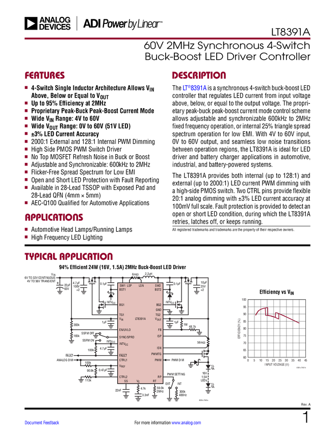LT8391A 60V 2MHz Synchronous 4-Switch Buck-Boost LED Driver Controller