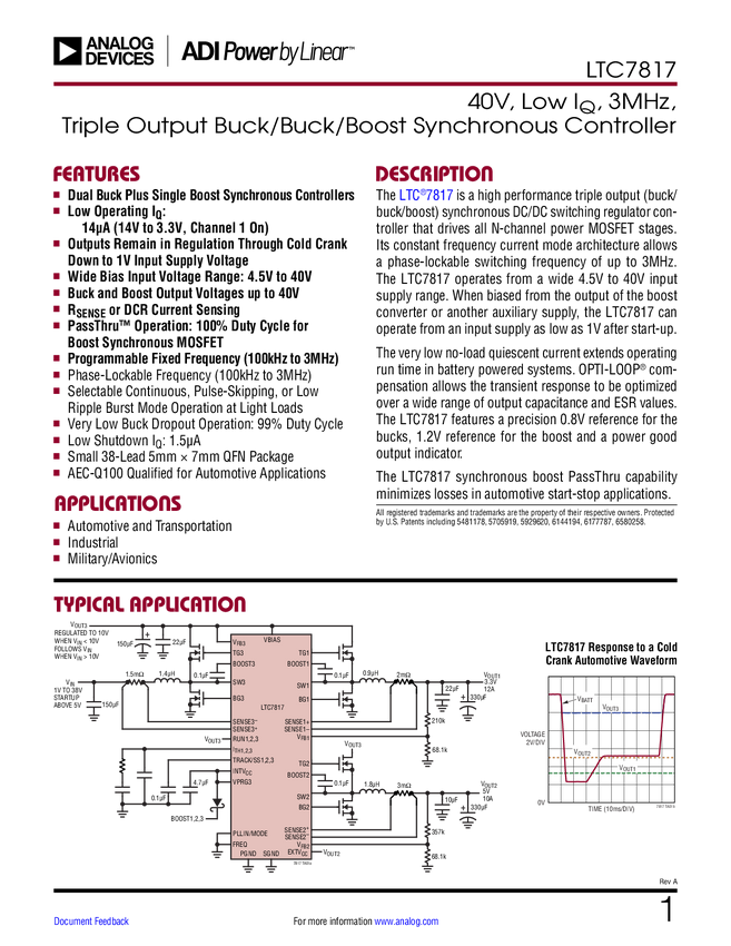 LTC7817 40V, Low I, 3MHz, Triple Output Buck/Buck/Boost Synchronous Controller