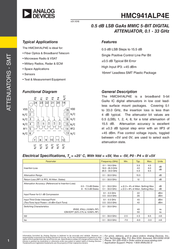 HMC941ALP4E 0.5 dB LSB GaAs MMIC 5-Bit Digital Attenuator, 0.1 - 33 GHz