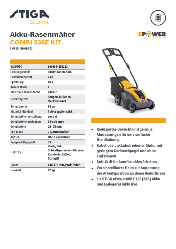 STIGA COMBI 336e akumulatorowy Kosiarka z regulacją wysokości koszenia, zaw. akumulator, zaw. ładowarkę 48 V Maksymalna