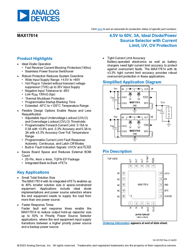 MAX17614 4.5V to 60V, 3A, Ideal Diode/Power Source Selector with Current Limit, UV,...