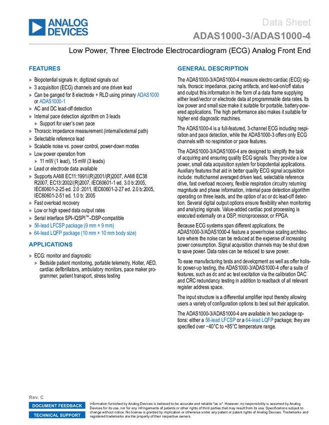 ADAS1000-3 Low Power, 3-Electrode Electrocardiogram (ECG) Analog Front End