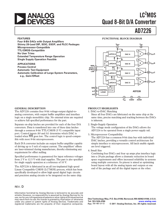AD7226 LCCMOS, Quad 8-Bit Voltage Output DAC