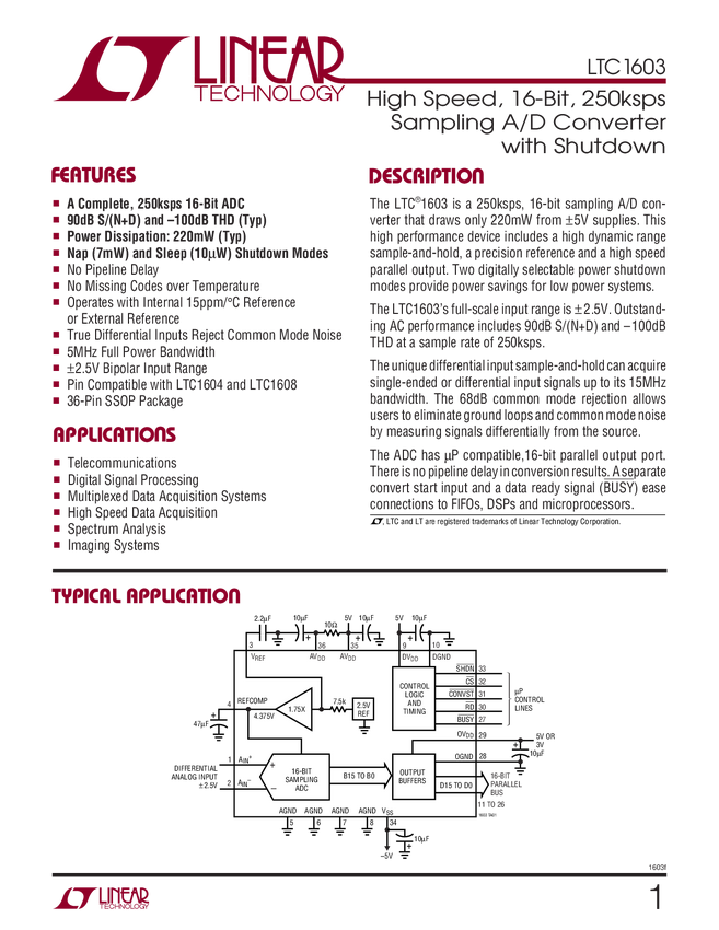 LTC1603 High Speed, 16-Bit, 250ksps Sampling A/D Converter with Shutdown