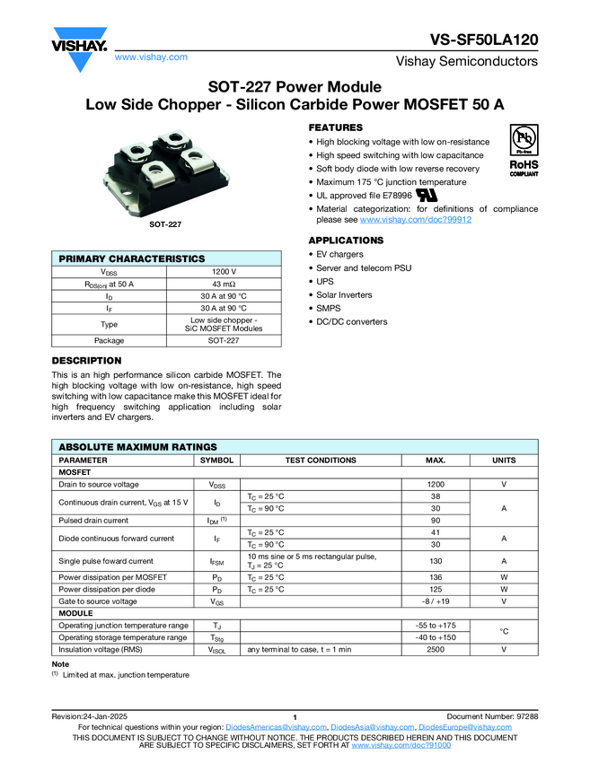 VS-SF50LA120 SOT-227 Power Module Low Side Chopper - Silicon Carbide Power MOSFET 50 A