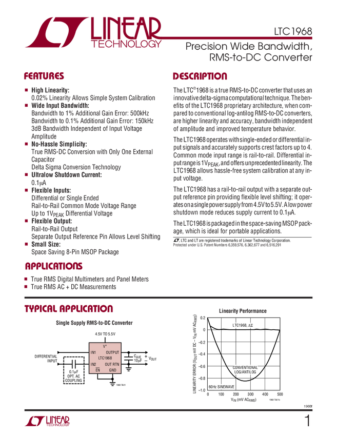 LTC1968 Precision Wide Bandwidth, RMS-to-DC Converter