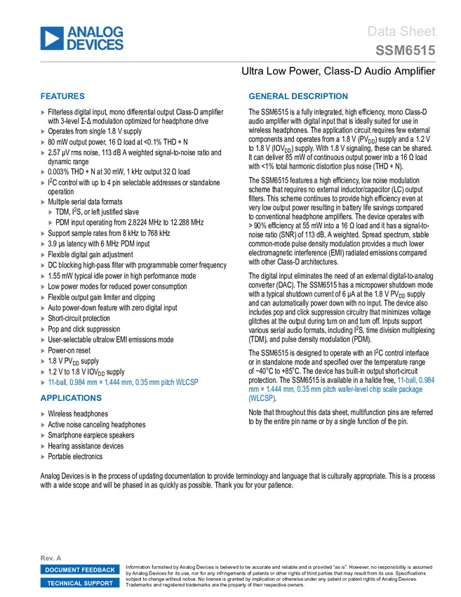 SSM6515 Ultra Low Power, Class-D Audio Amplifier