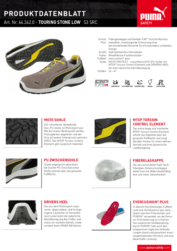 PUMA TOURING STONE LOW S3 SRC 643420801000047 Obuwie ochronne S3 Rozmiar buta (EU): 47 stone 1 par(a)
