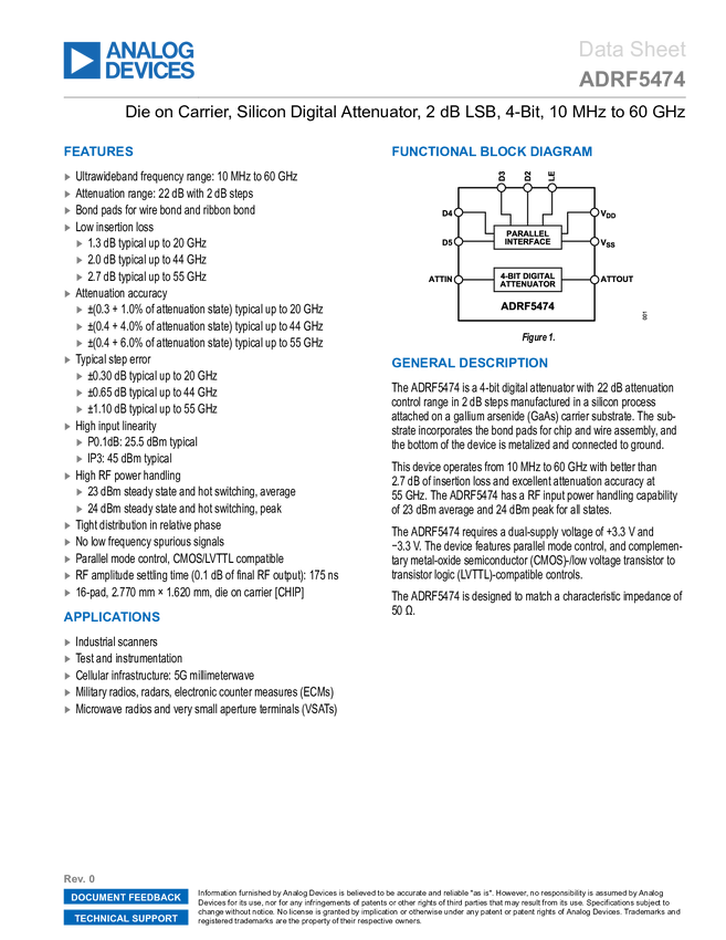 ADRF5474 Die on Carrier, Silicon Digital Attenuator, 2 dB LSB, 4-Bit, 10 MHz to 60 G...
