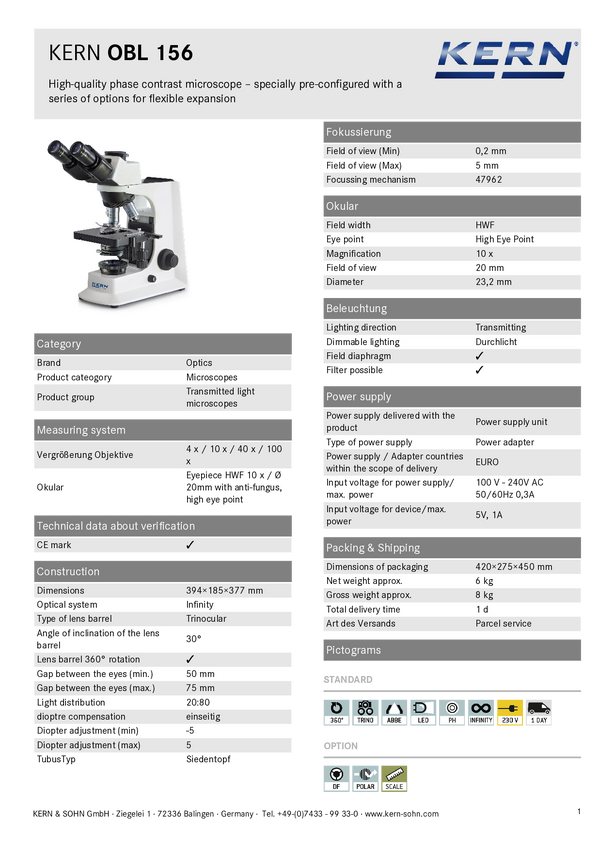 OBL 156 Kern OBL 156 OBL 156 Mikroskop światła przechodzącego trzyokularowy 20 x św...