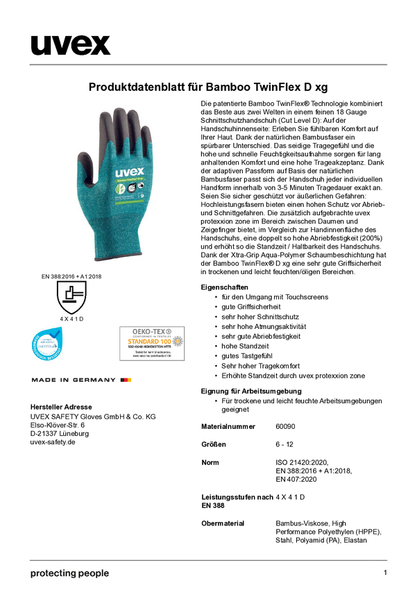 uvex Bamboo TwinFlex D xg 6009006 Rękawice chroniące przed przecięciem Rozmiar rękawic: 6 EN 397 1 par(a)