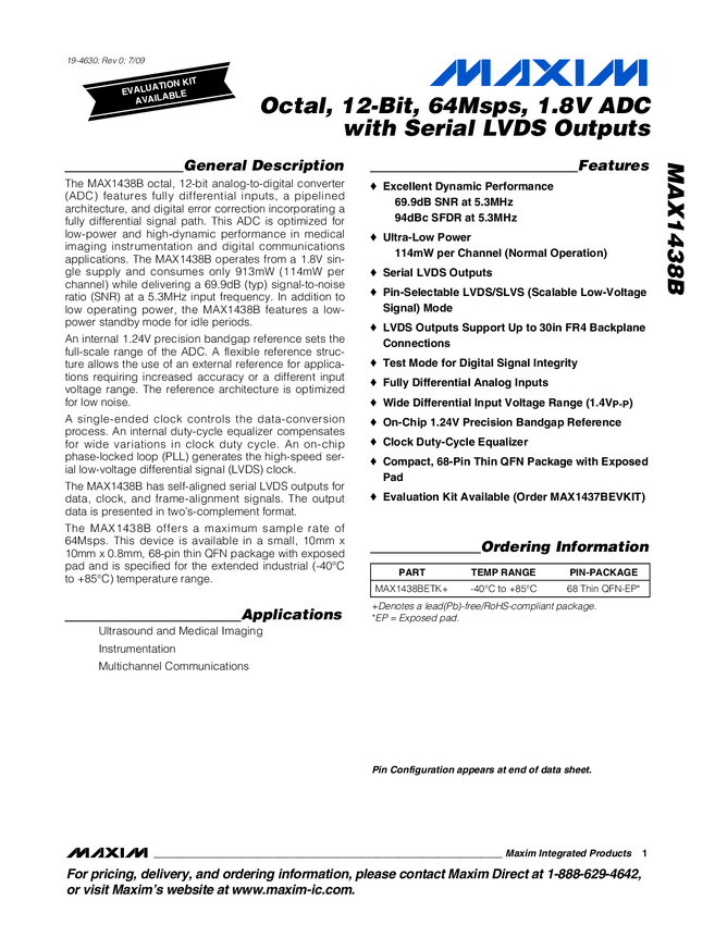 MAX1438B Octal, 12-Bit, 64Msps, 1.8V ADC with Serial LVDS Outputs