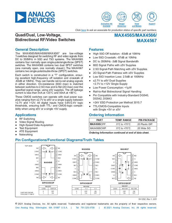MAX4566 Quad/Dual, Low-Voltage, Bidirectional RF/Video Switches