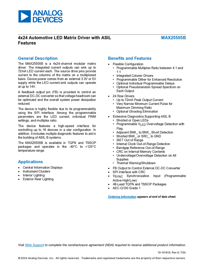 MAX25505B 4x24 Automotive LED Matrix Driver with ASIL Features