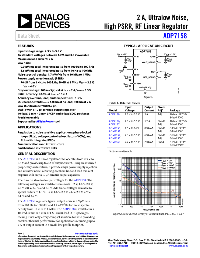 ADP7158 2 A, Ultralow Noise, High PSRR, Fixed Output, RF Linear Regulator