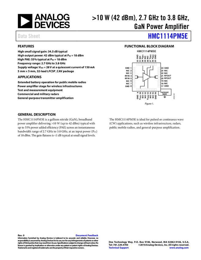 HMC1114PM5E >10 W (42 dBm), 2.7 GHz to 3.8 GHz, GaN Power Amplifier