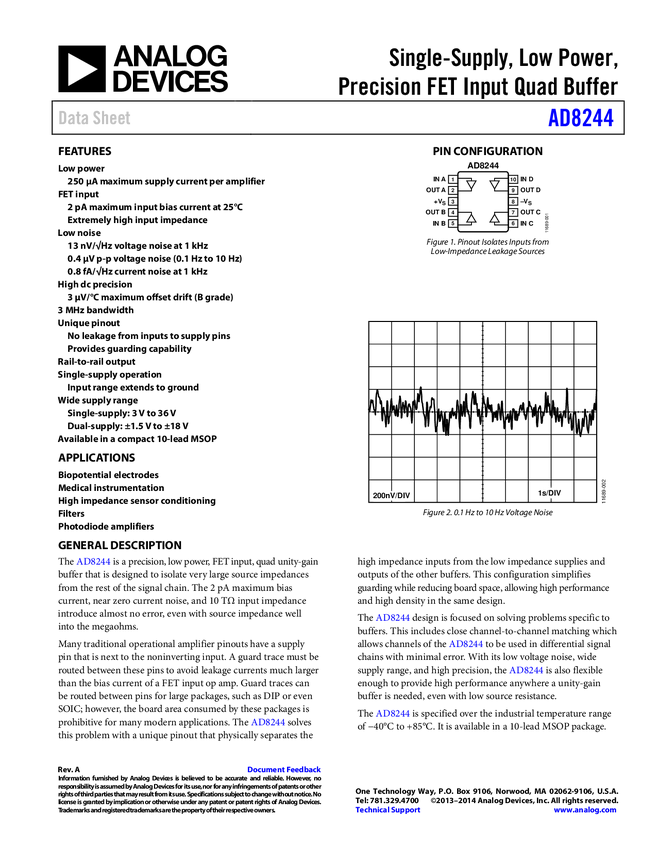 AD8244 Single-Supply, Low Power, Precision FET Input Quad Buffer