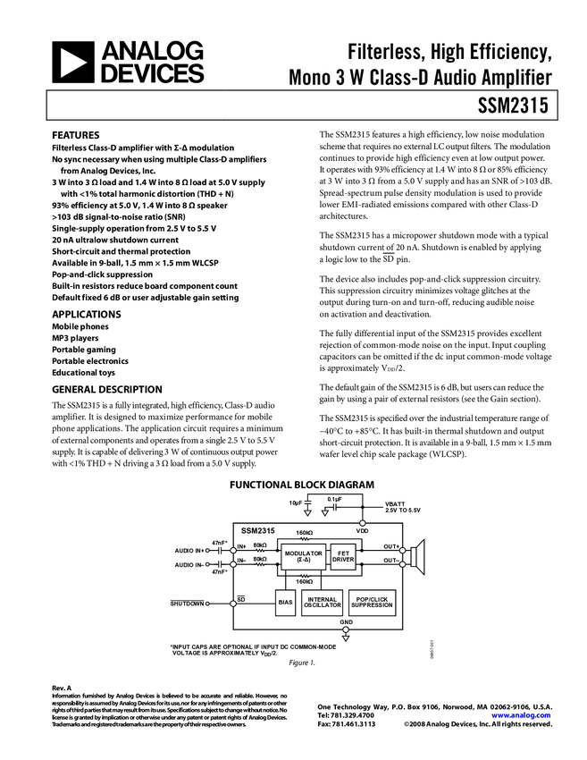 SSM2315 Filterless, High Efficiency, Mono 3 W Class-D Audio Amplifier