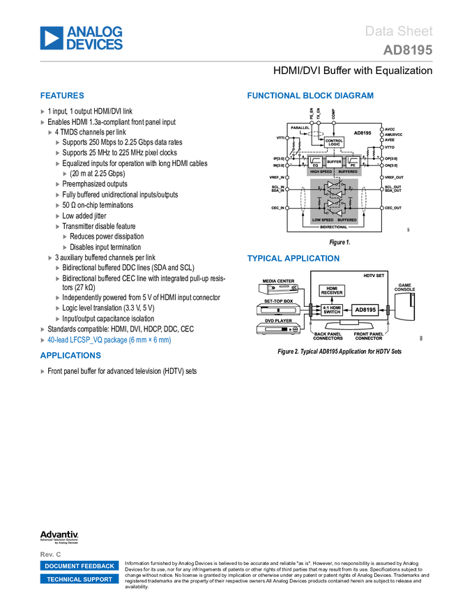 AD8195 1:1 HDMI/DVI Buffer with Equalization