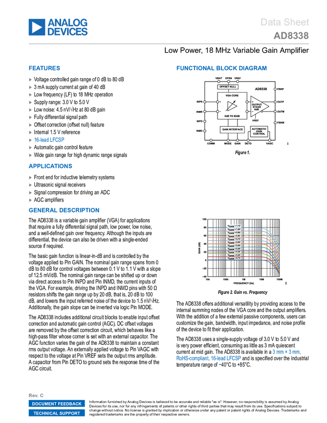 AD8338 Low Power, 18 MHz Variable Gain Amplifier