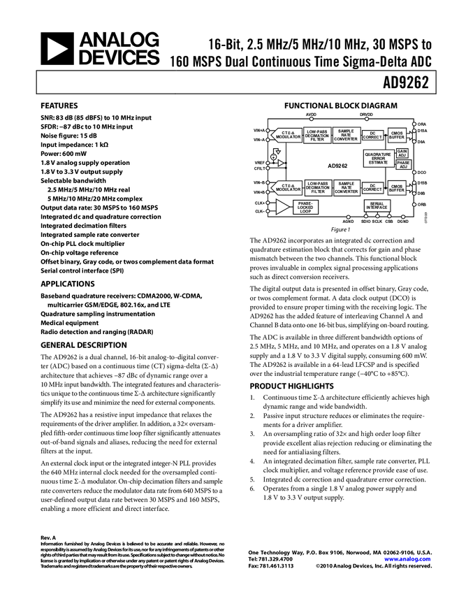 AD9262 16-Bit, 2.5 MHz/5 MHz/10 MHz, 30 MSPS to 160 MSPS Dual Continuous Time Sigm...