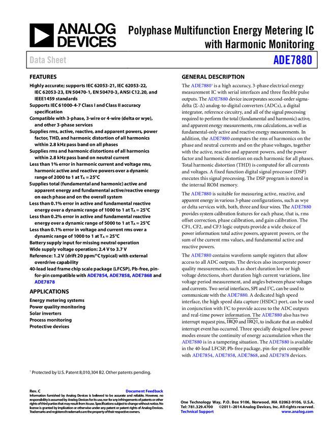 ADE7880 Polyphase Multifunction Energy Metering IC with Harmonic Monitoring