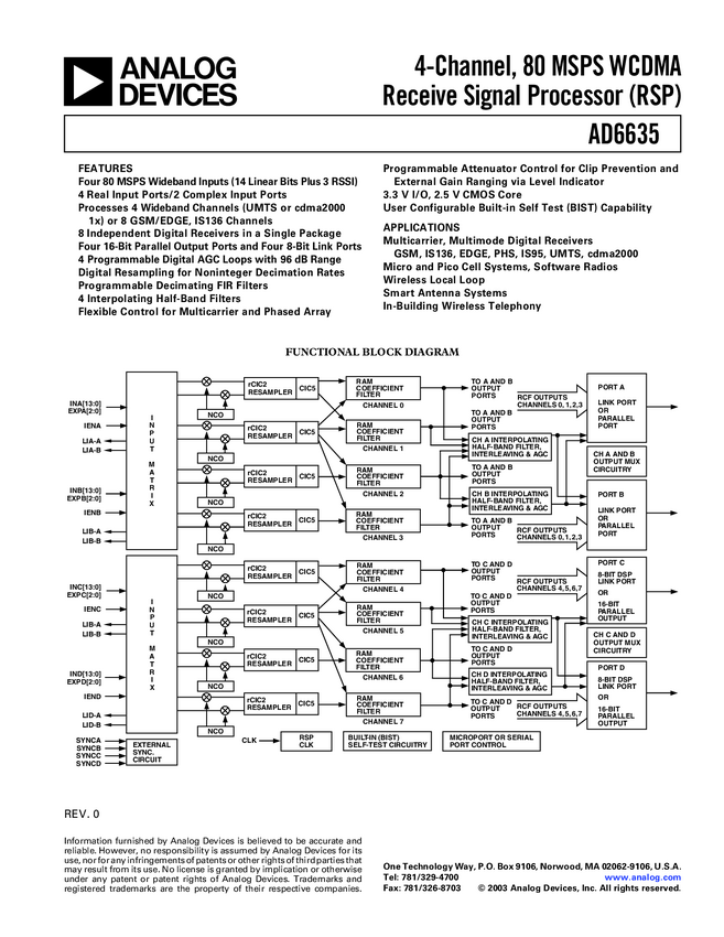 AD6635 Four-Channel, 80 MSPS WCDMA Receive Signal Processor (RSP)