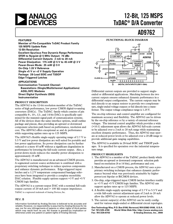 AD9762 12-Bit, 100 MSPS+ TxDAC® D/A Converter